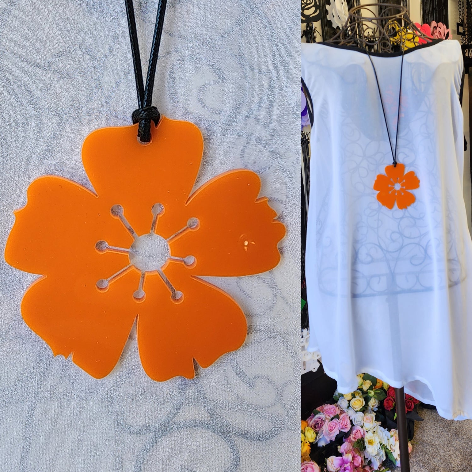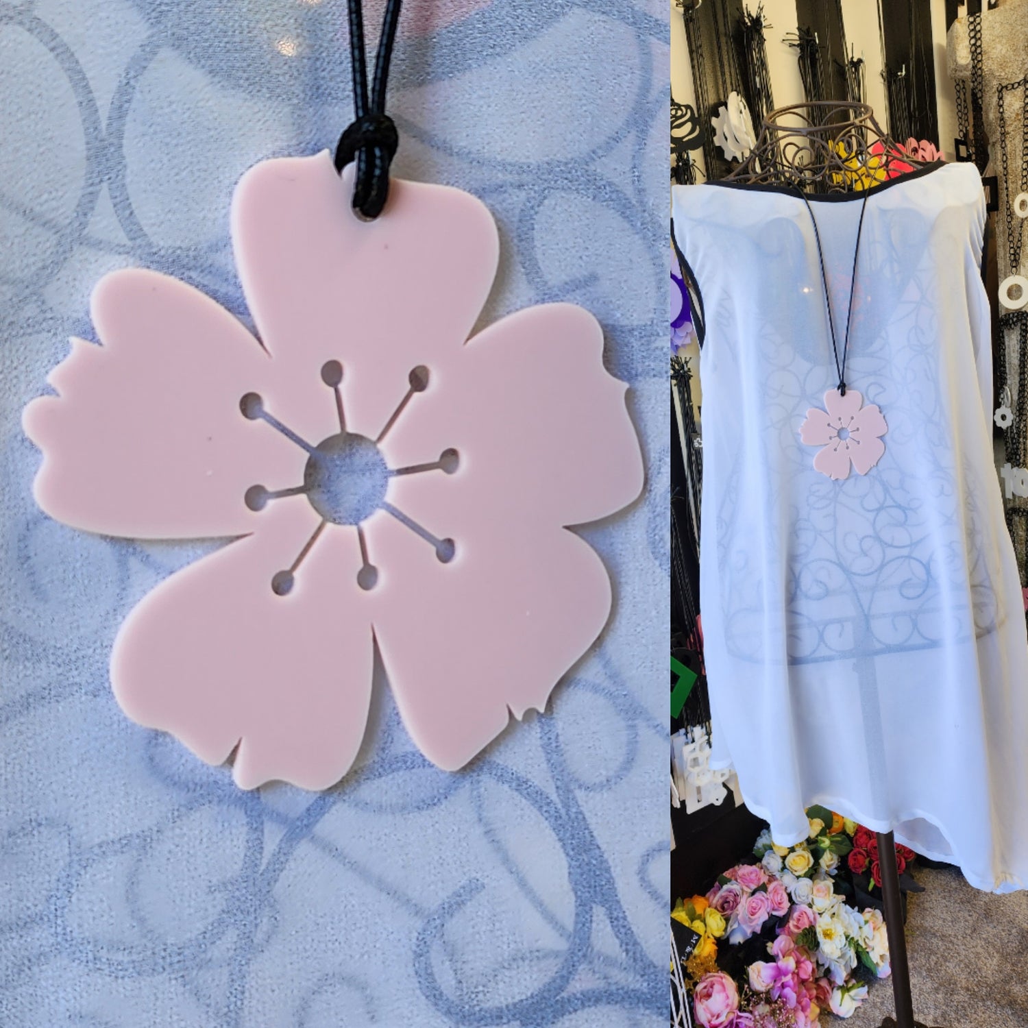 Blossom approximately 90mm in diameter, 3mm thick. Hung on soft pliable cord with an adjustment bead.