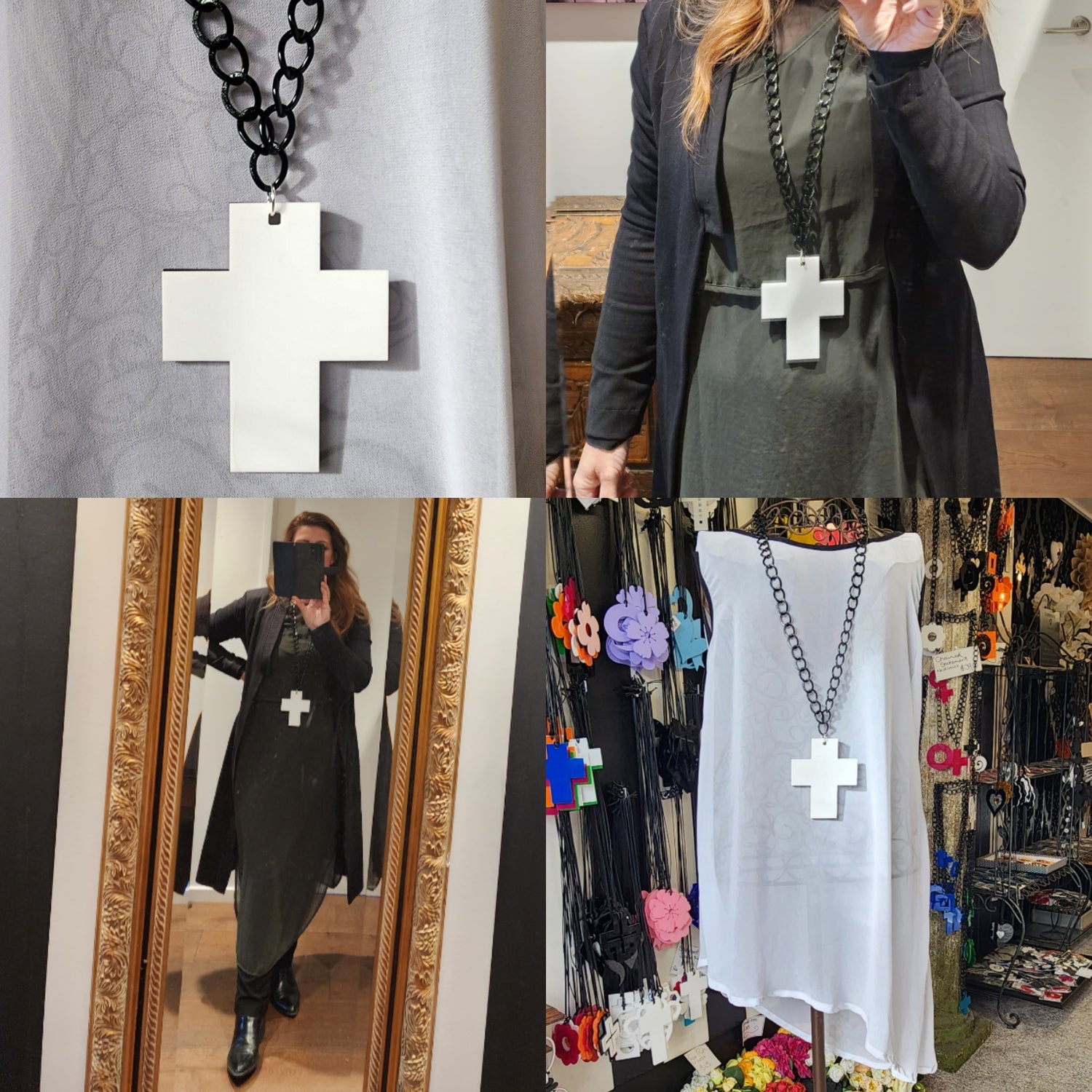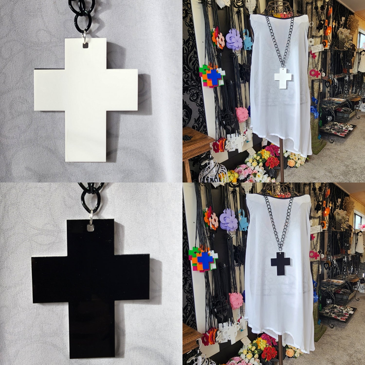Chunky Short Cross Cut from thick 6mm Acrylic and hung on long lightweight black Chain.