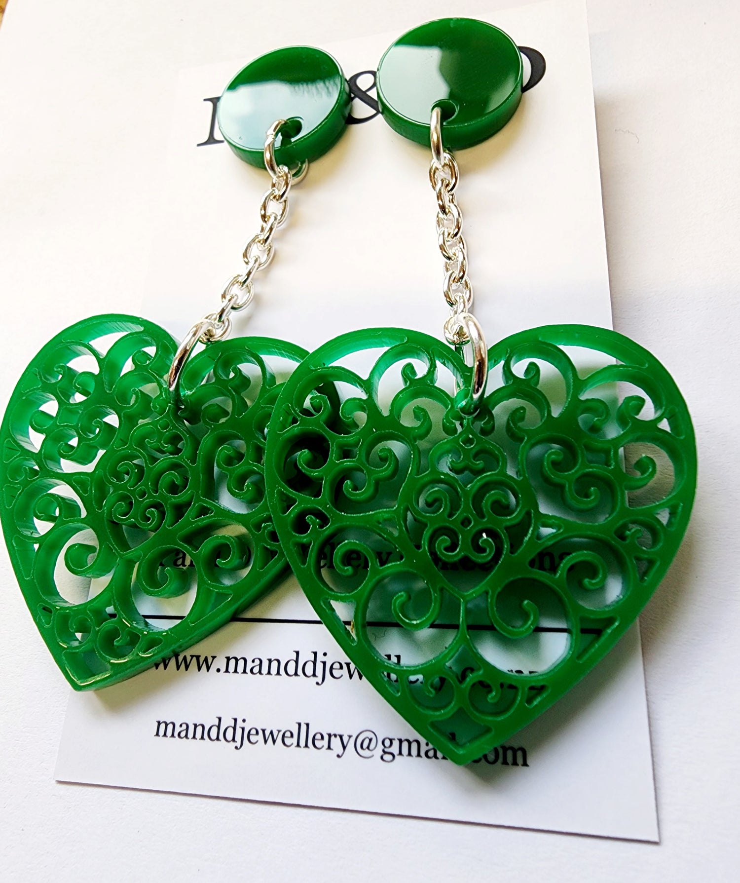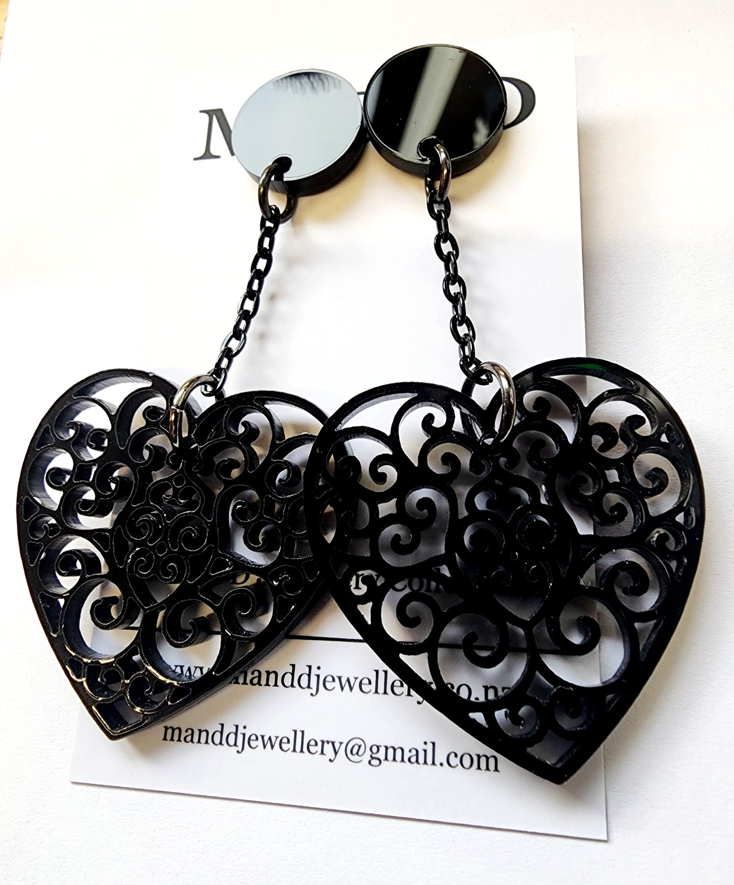 Stunningly Beautiful Filigree Heart Earrings hung on Chain to provide swing and length. Very Flattering!🖤