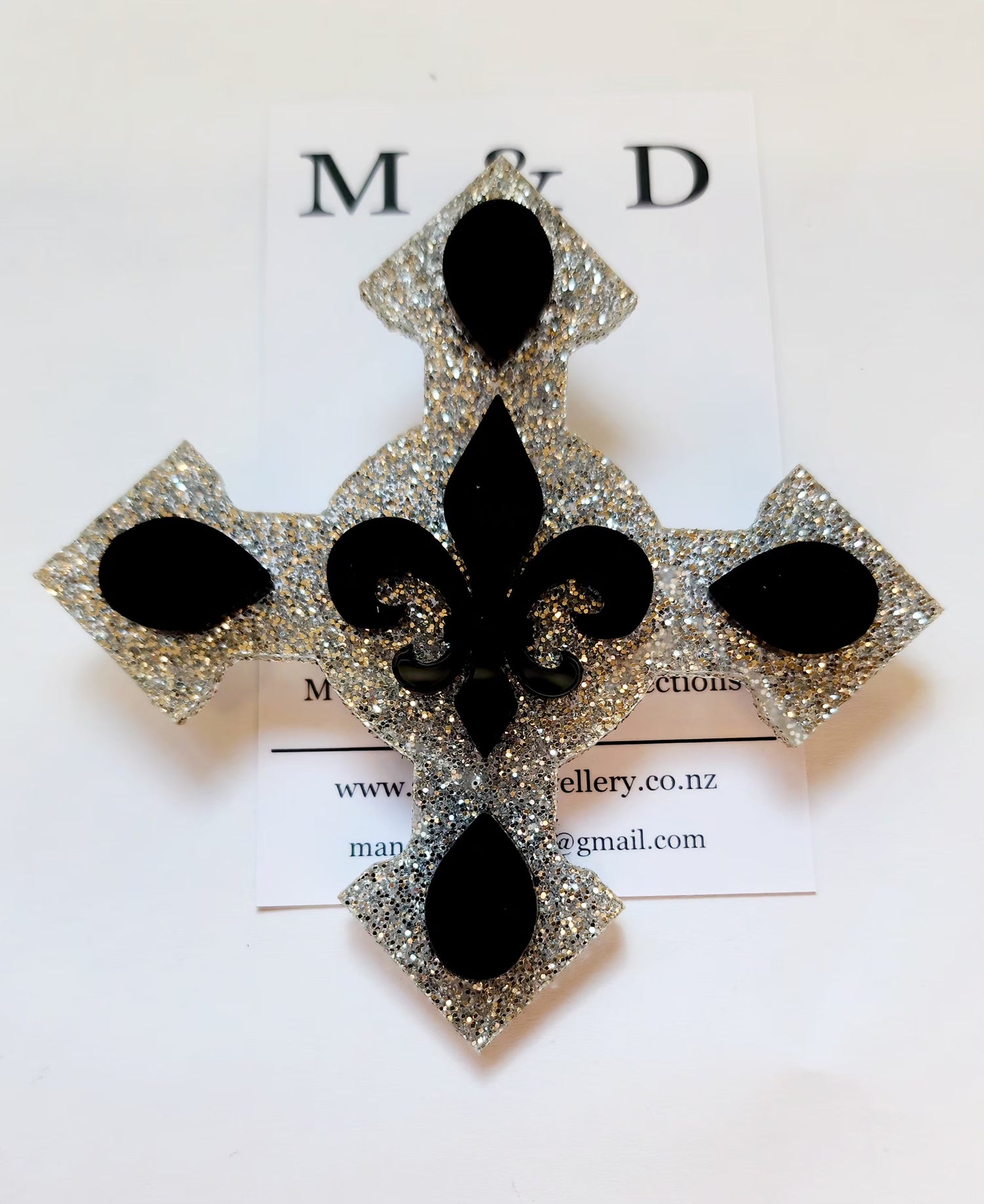 Brooch 4 point Silver Glitter Cross with Fleur de lis