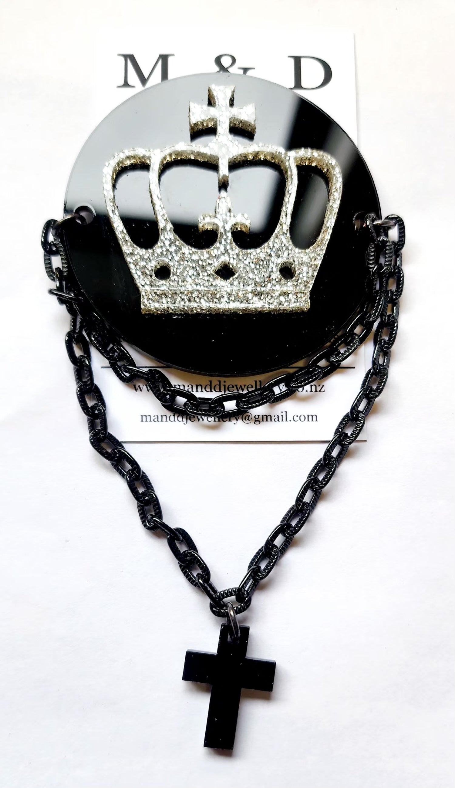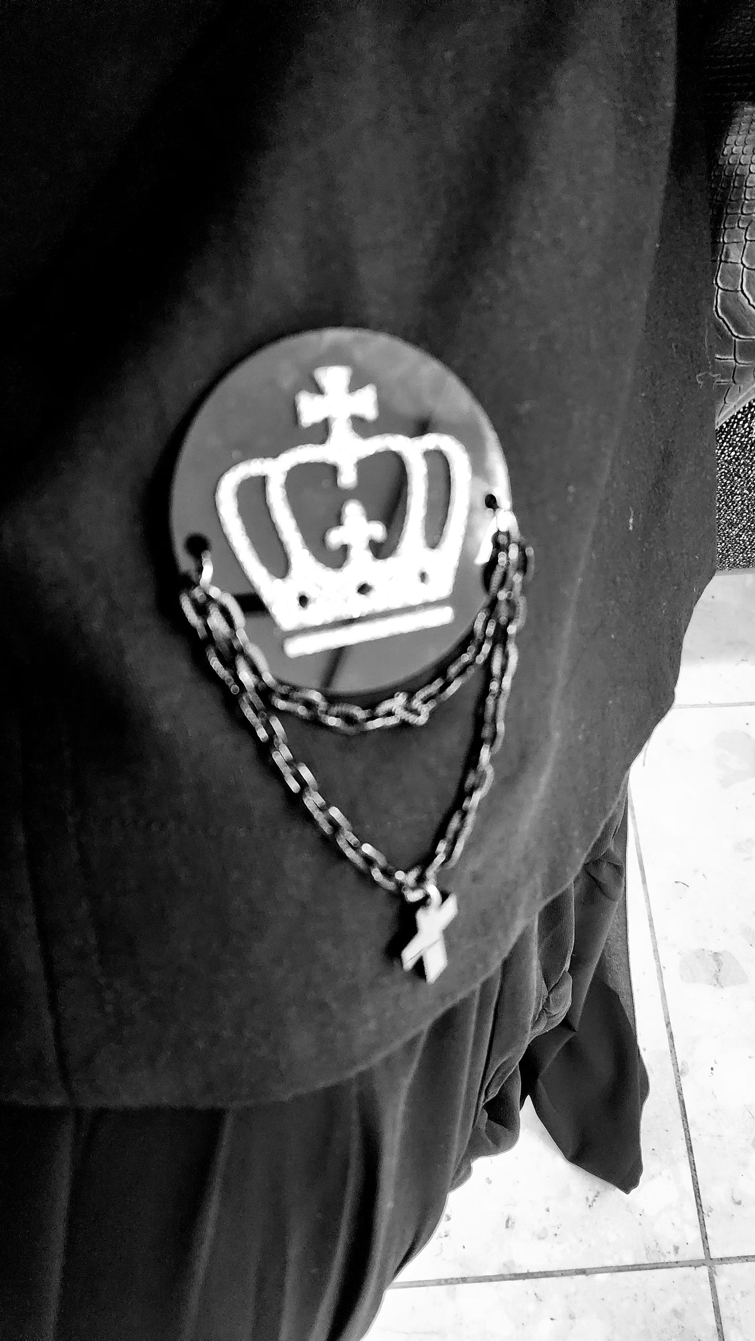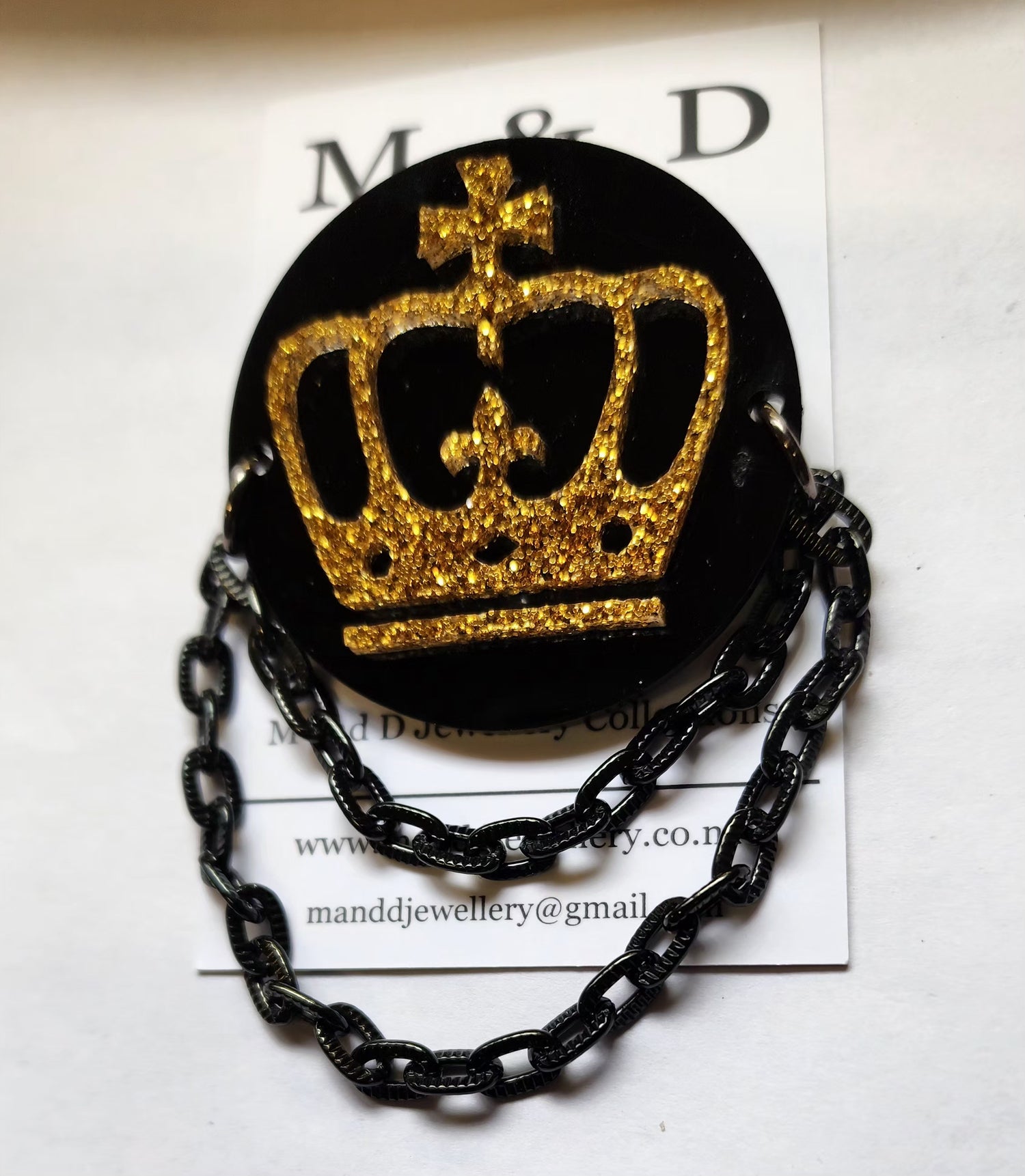 Cute Disc shaped Brooch with Crown layer and chain detail.