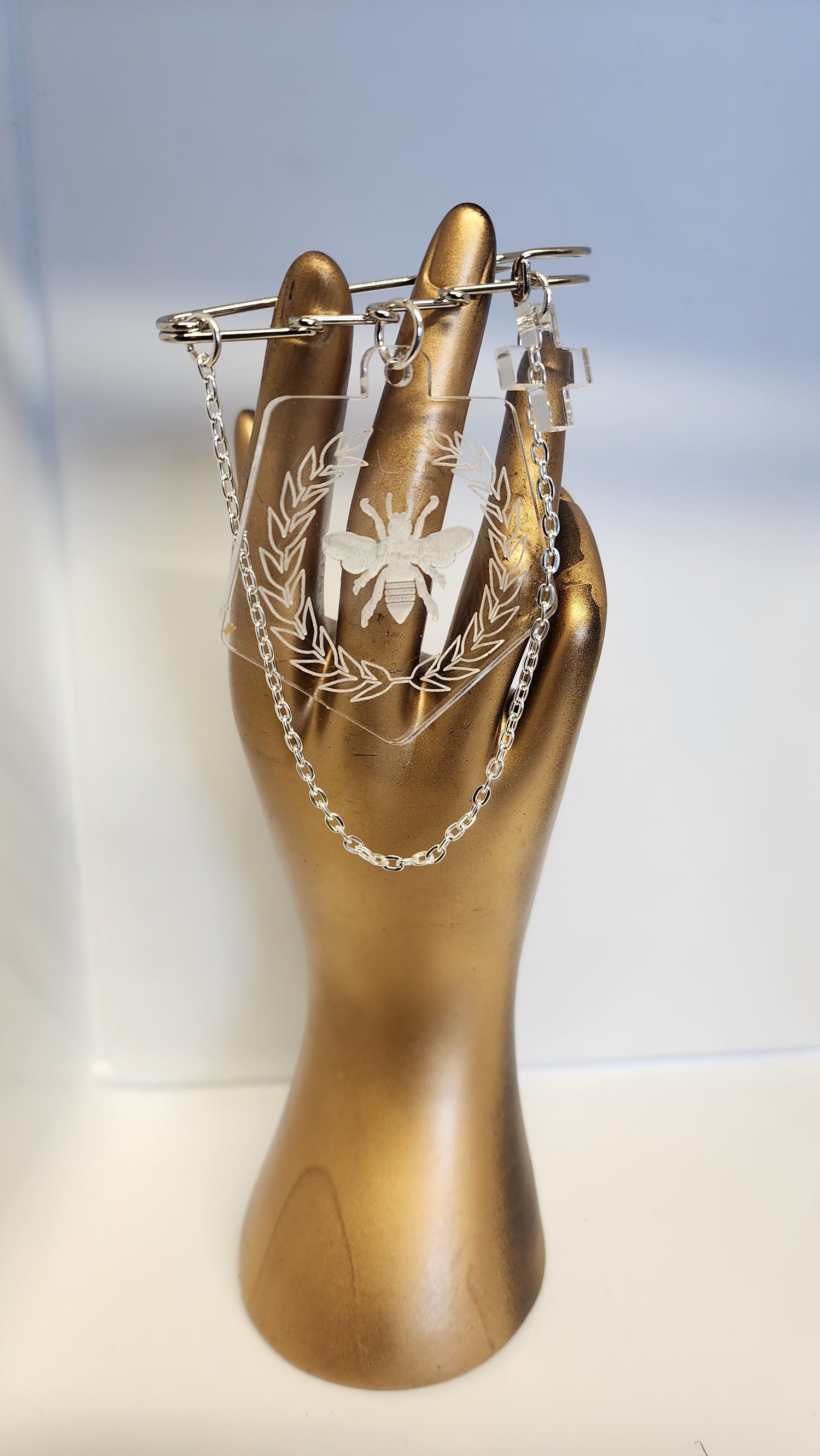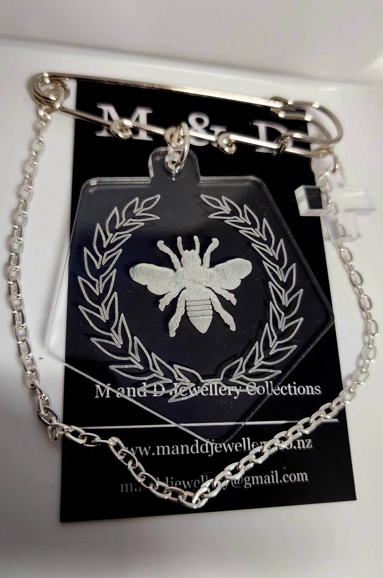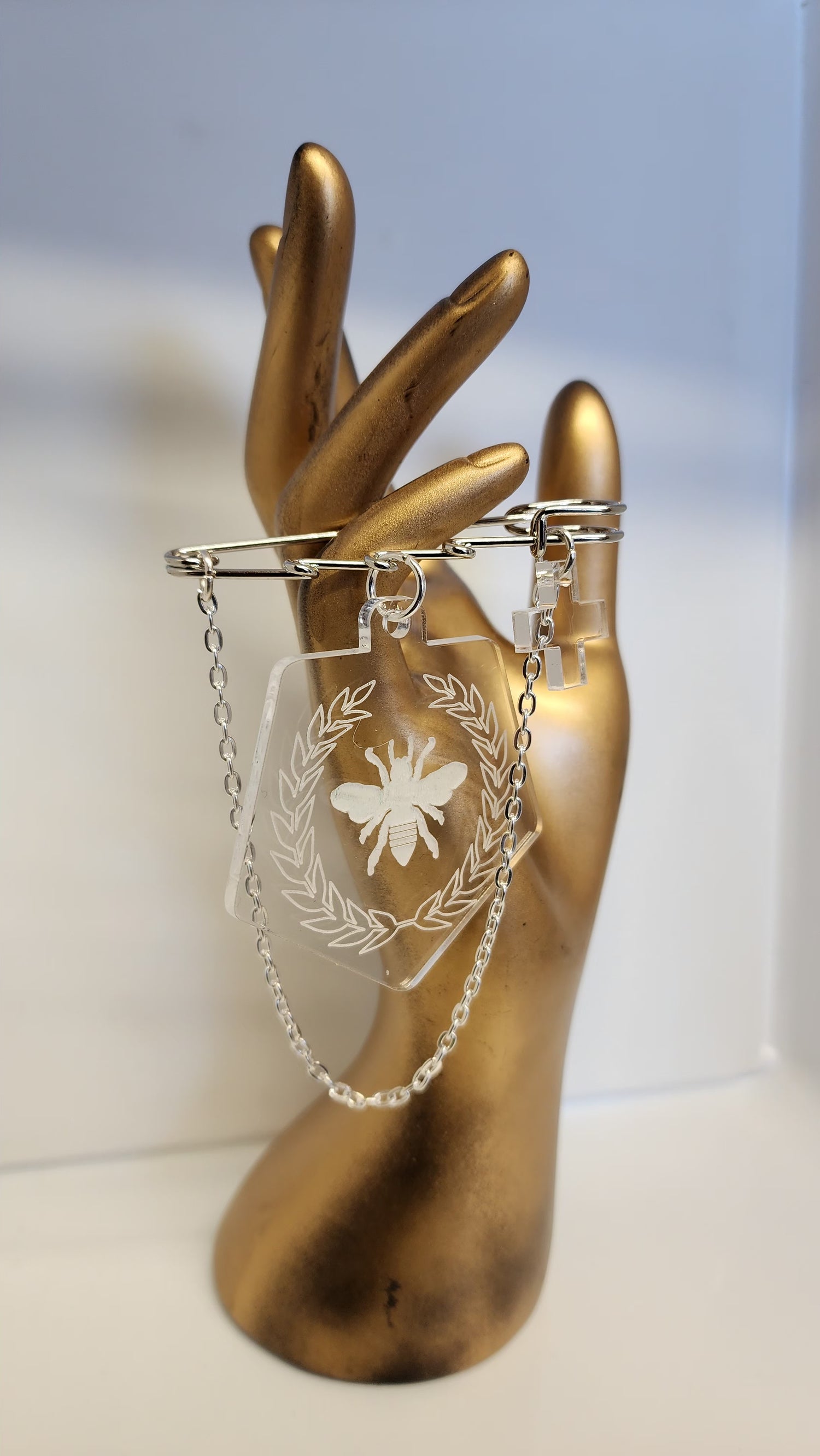 Kilt Pin Bee Engraved on Clear Brooch with Charm and chain detail