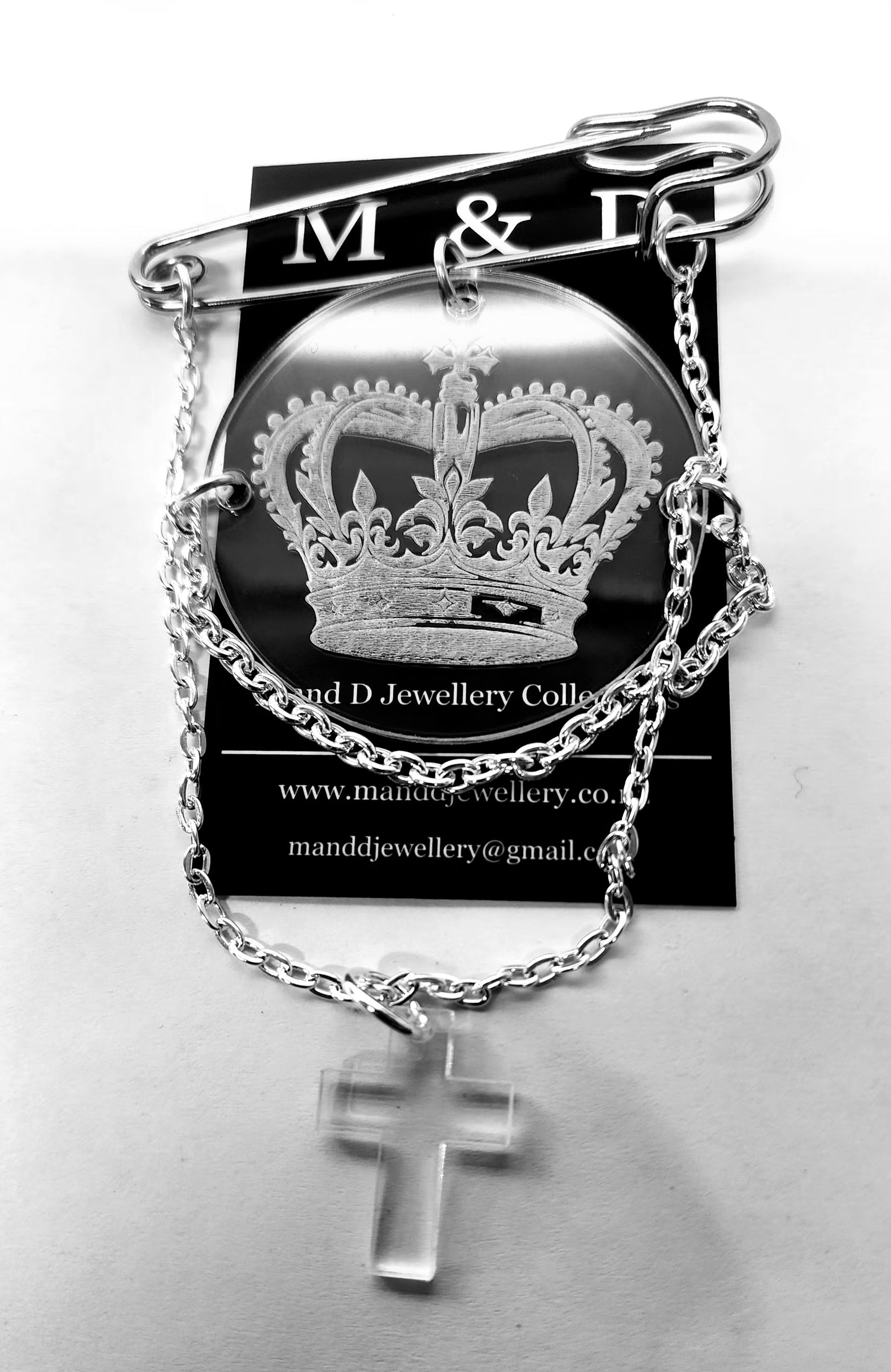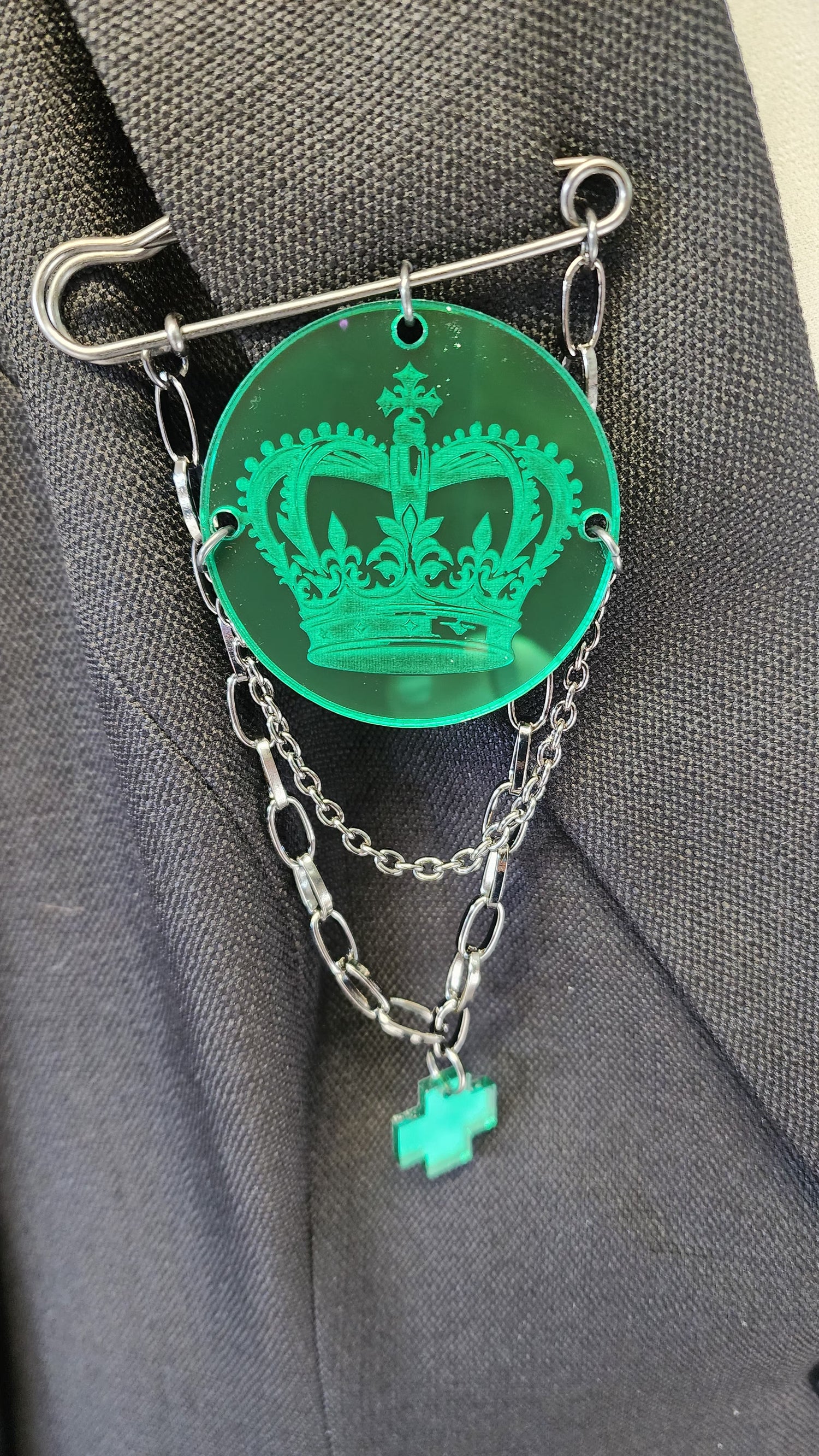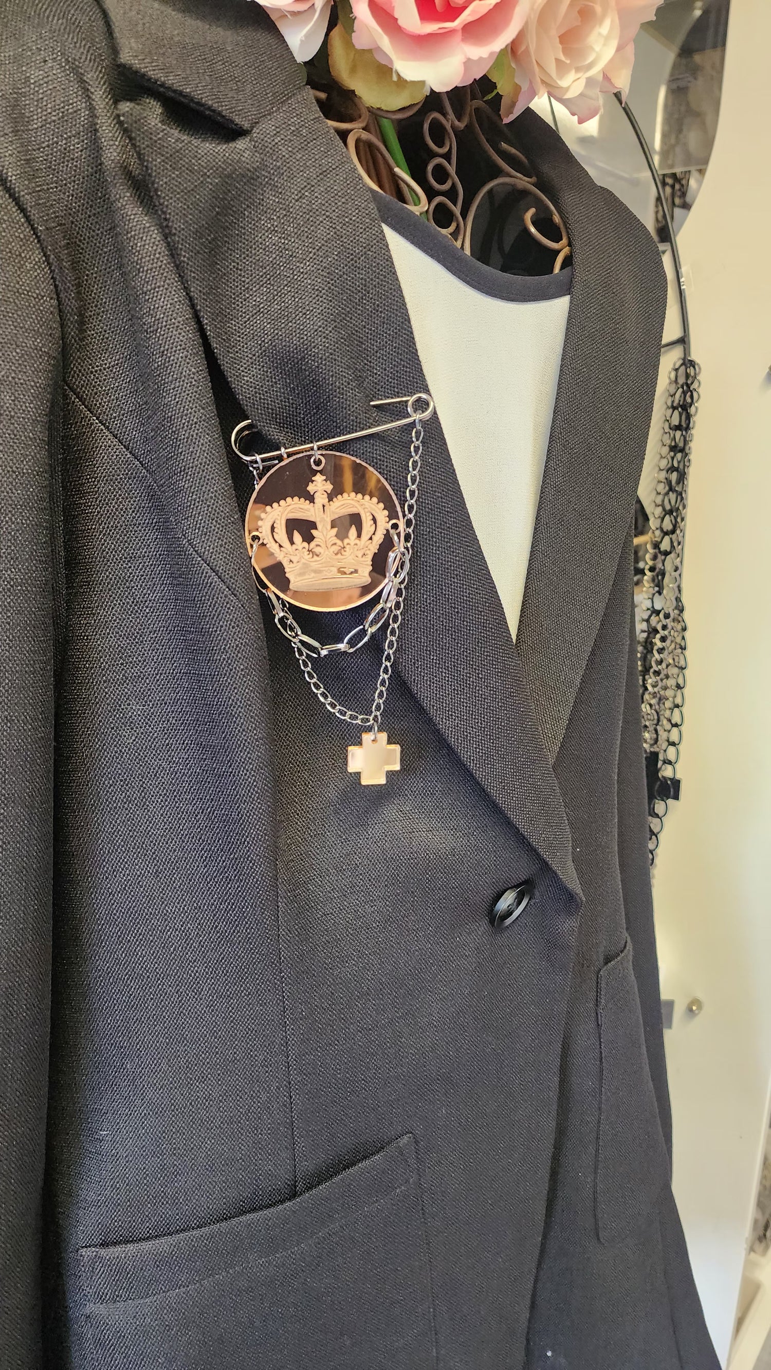 Kilt Pin Crown Engraved Mirror Brooch with chain and charm detail