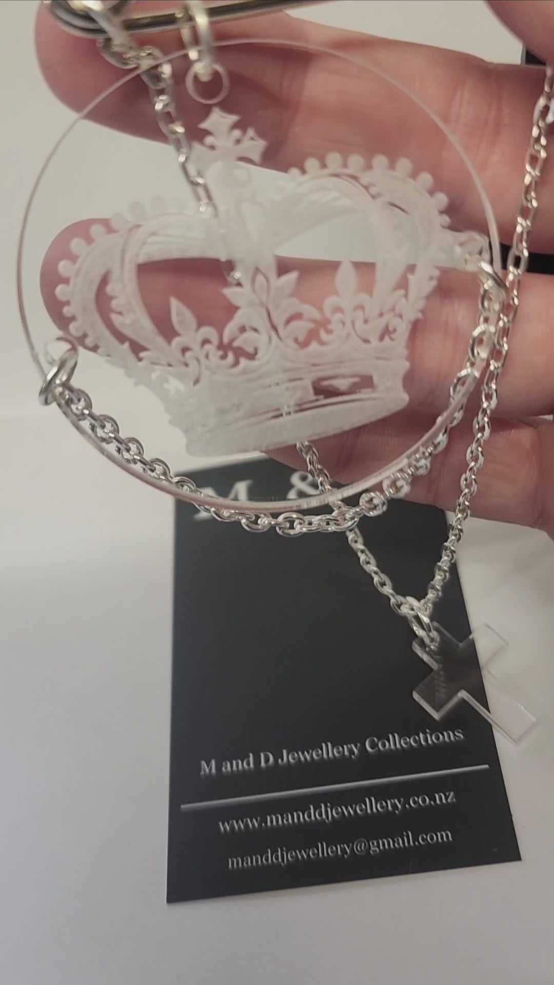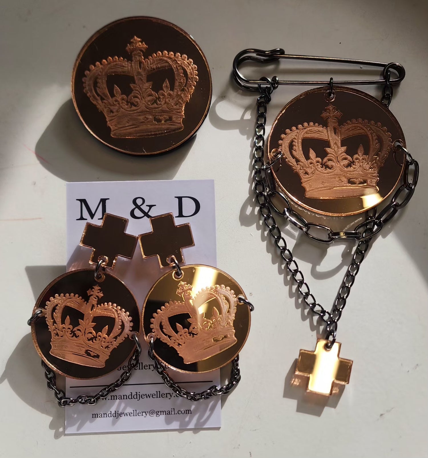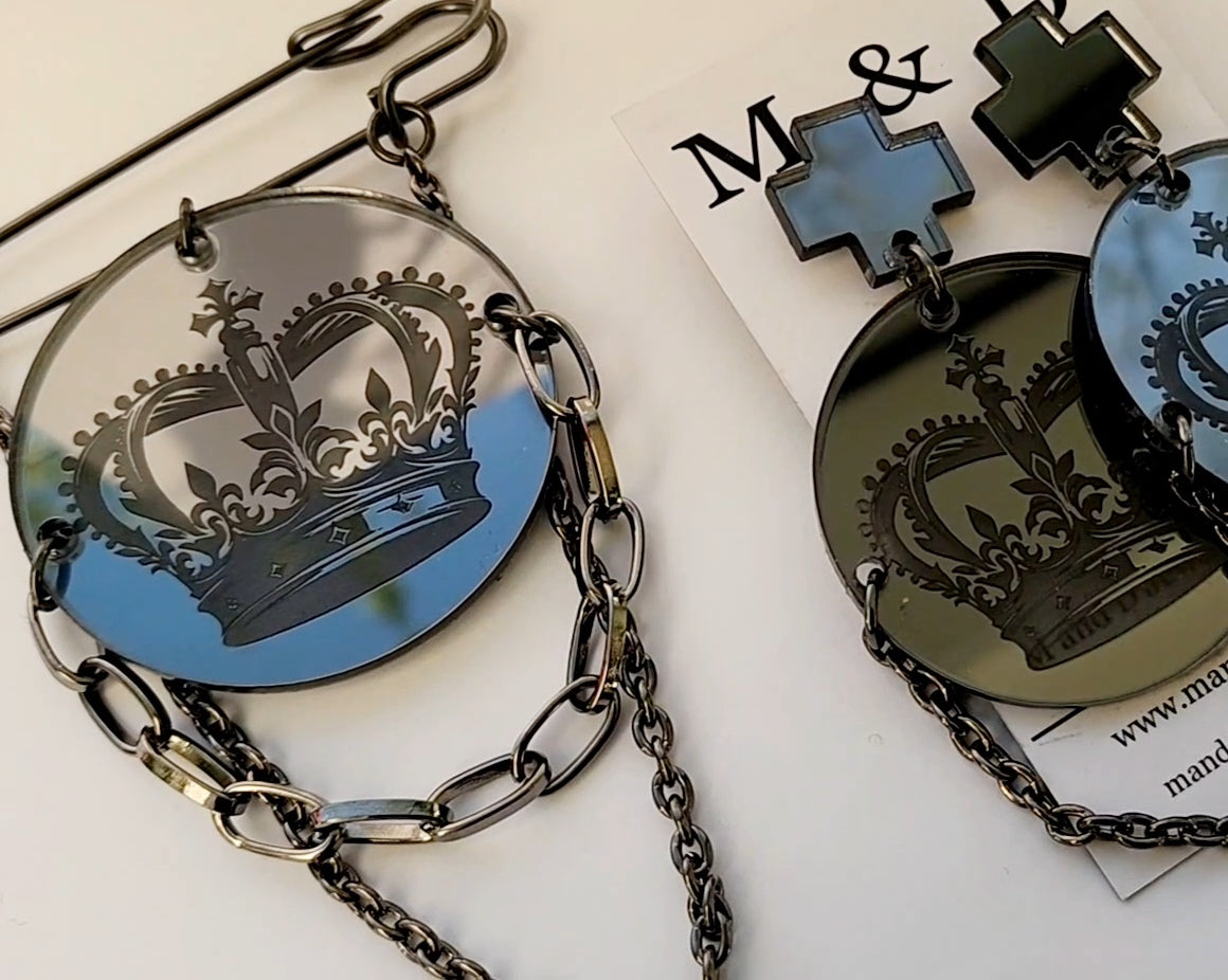 Kilt Pin Crown Engraved Mirror Brooch with chain and charm detail