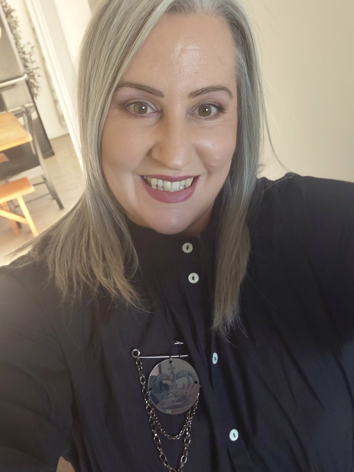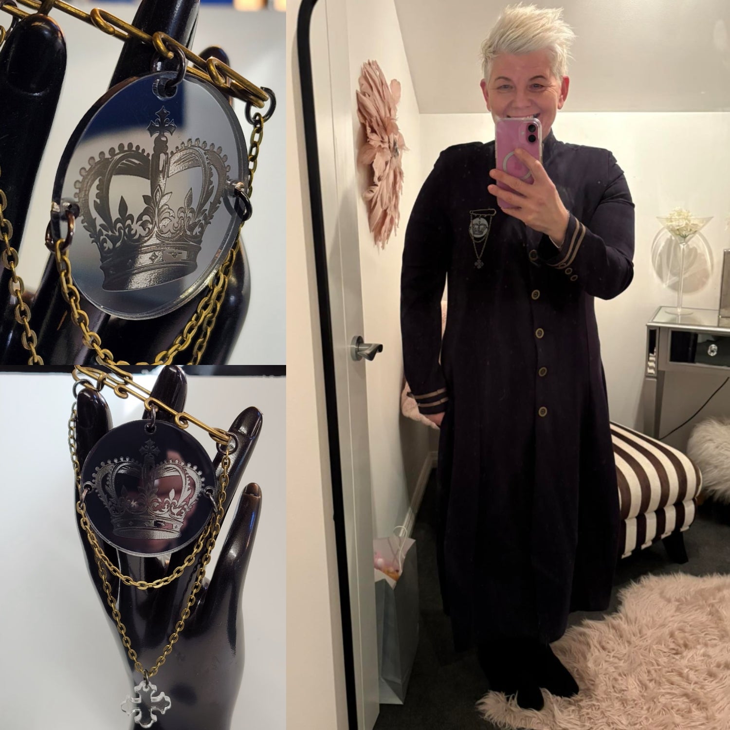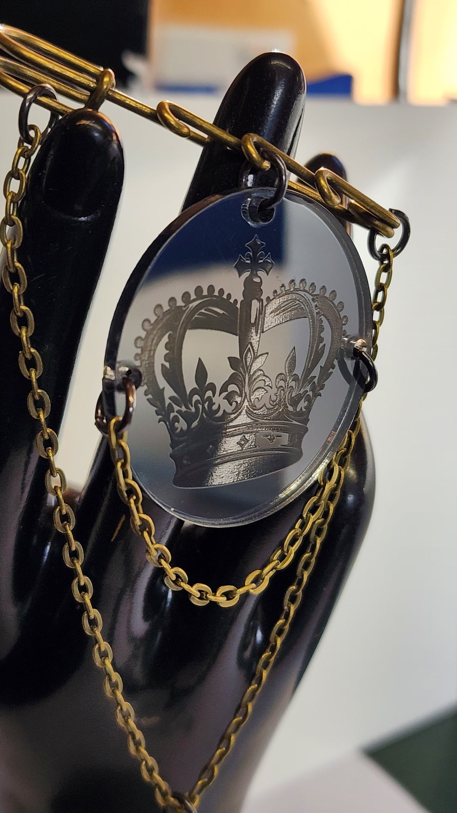 Cute Kilt Pin Mirror Brooch with Engraved Crown and chain detail.