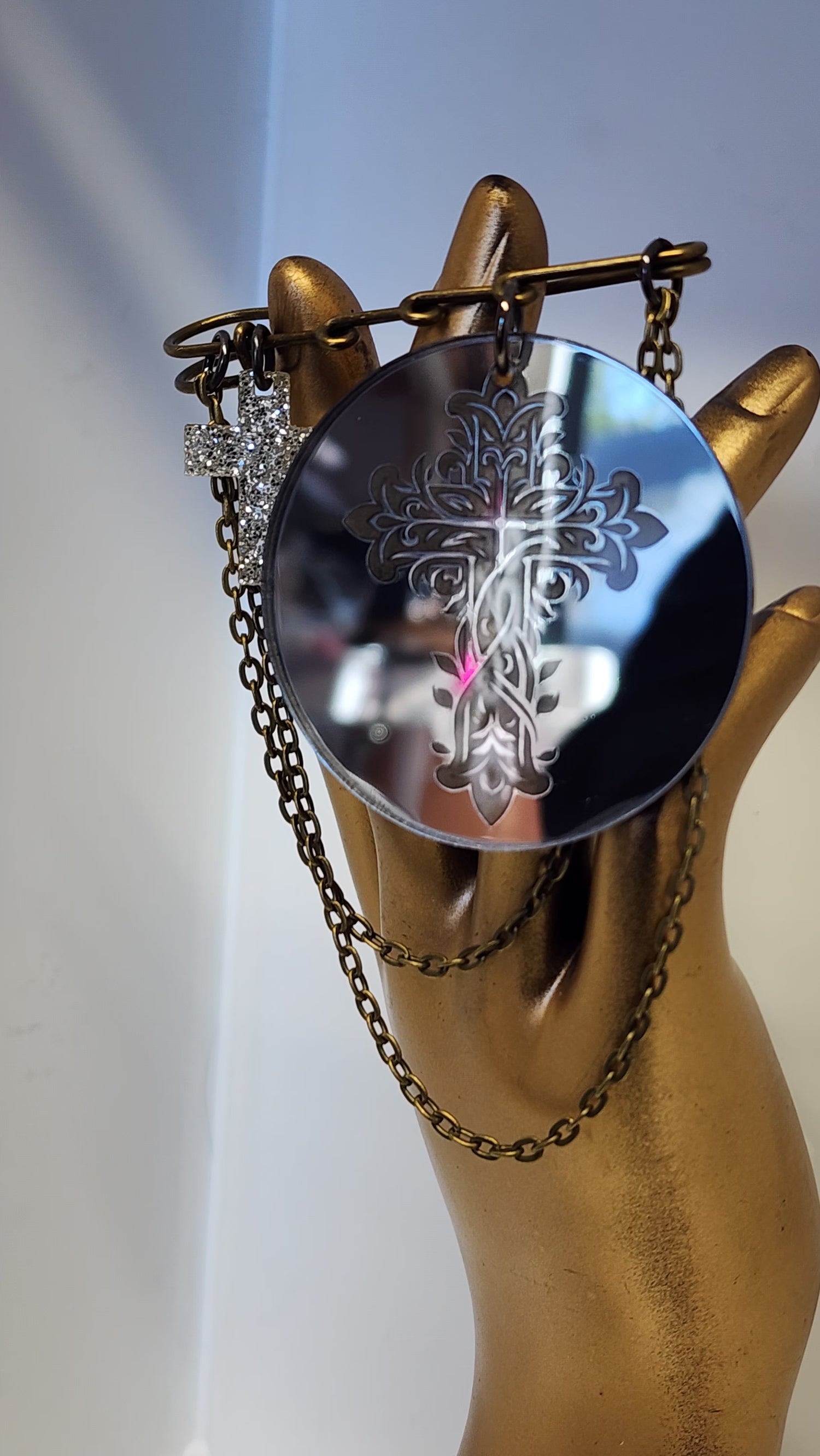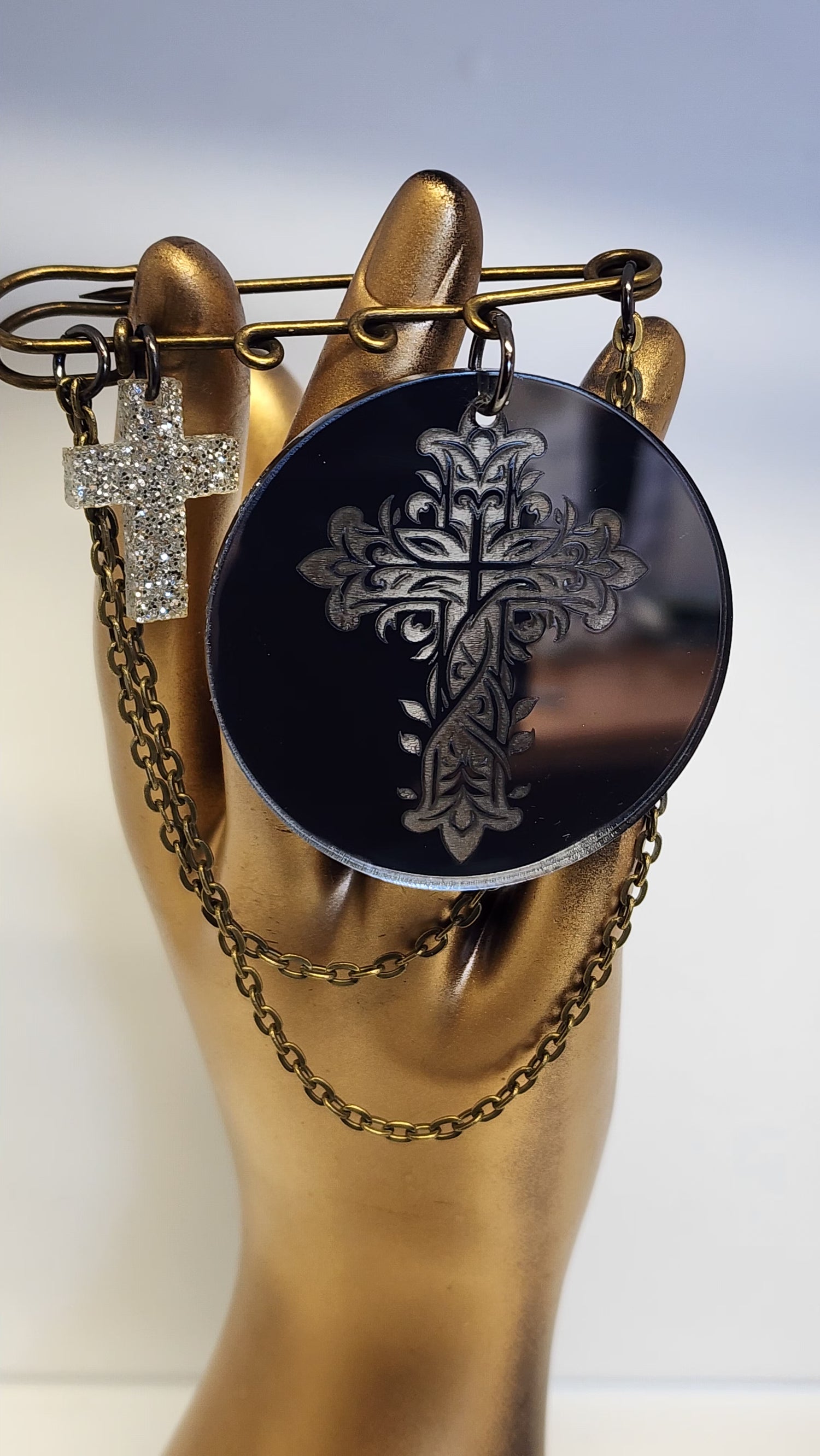 Kilt Pin Cross Engraved Mirror Brooch with chain and charm detail