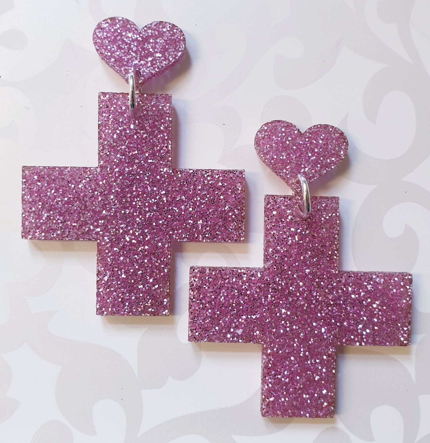 Glitter Solid Cross with Heart post Earrings Stud Dangles