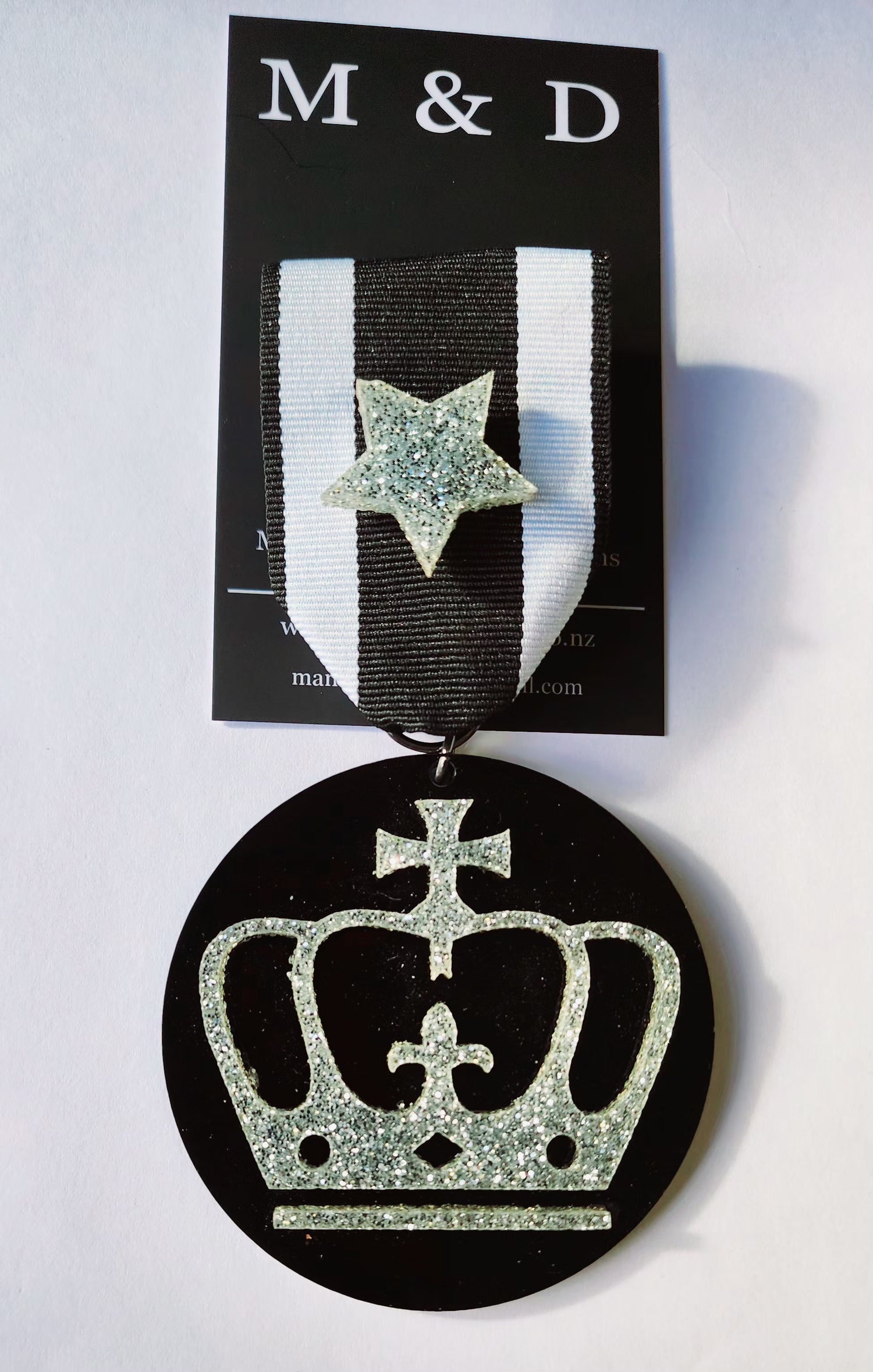 Ribbon Brooch Silver Glitter Crown Layered on Black Disc with detachable Star Pin