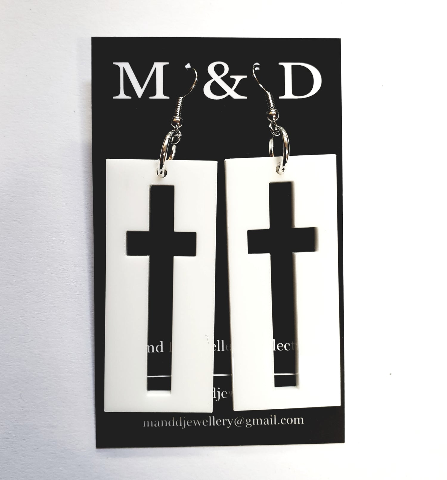 Cool Tag earrings with a cross cutout, cut from 3mm acrylic