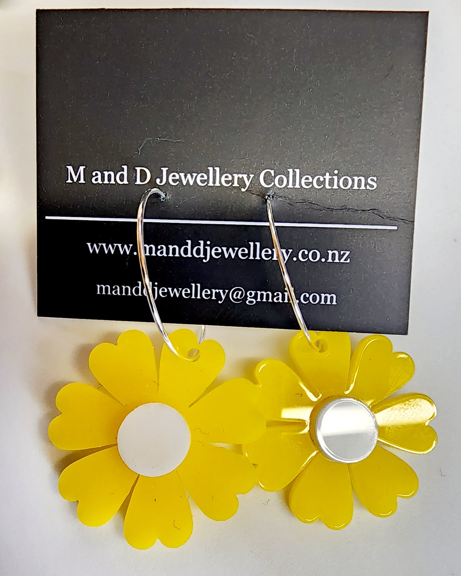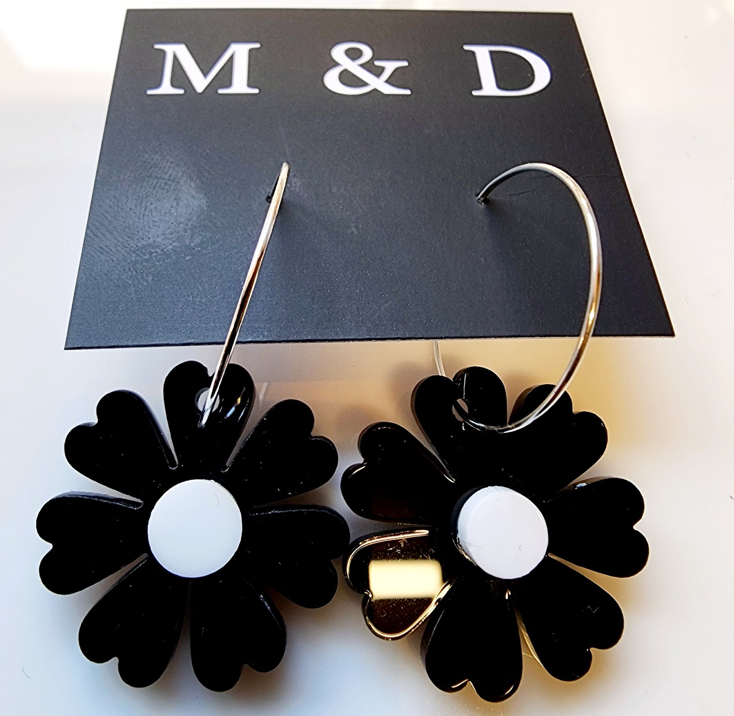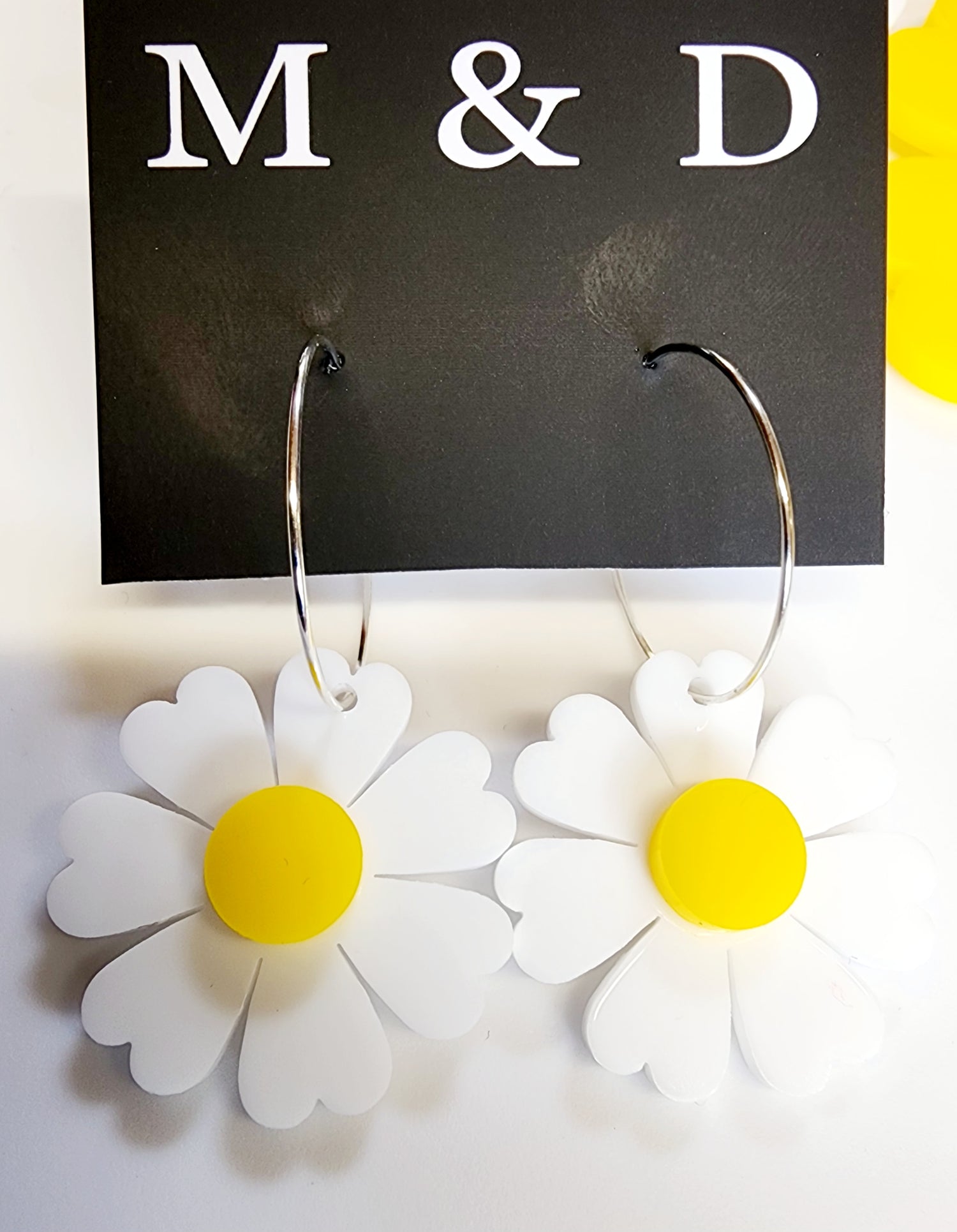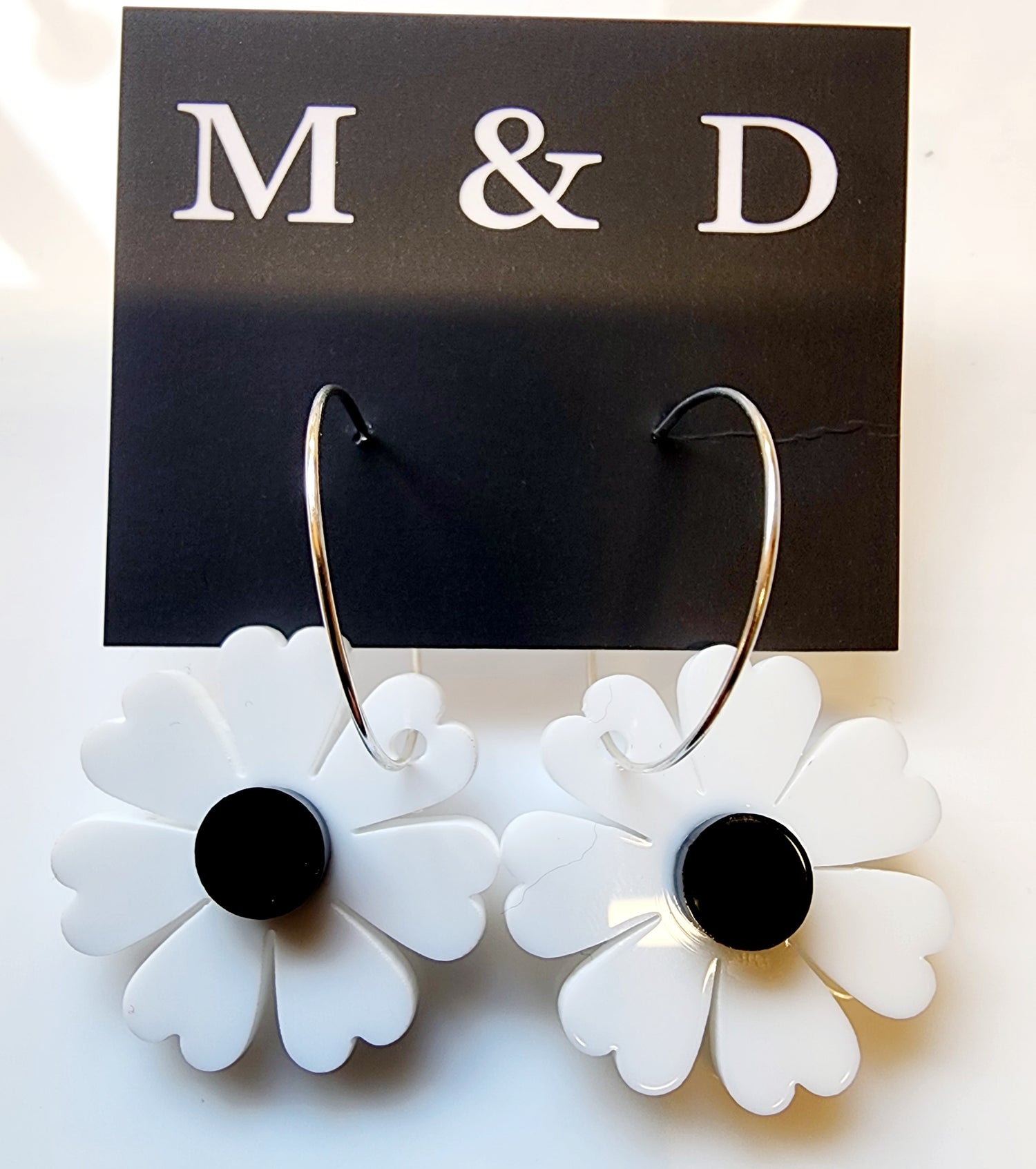 Stylish acrylic earrings hung on hypoallergenic stainless steel hoops.