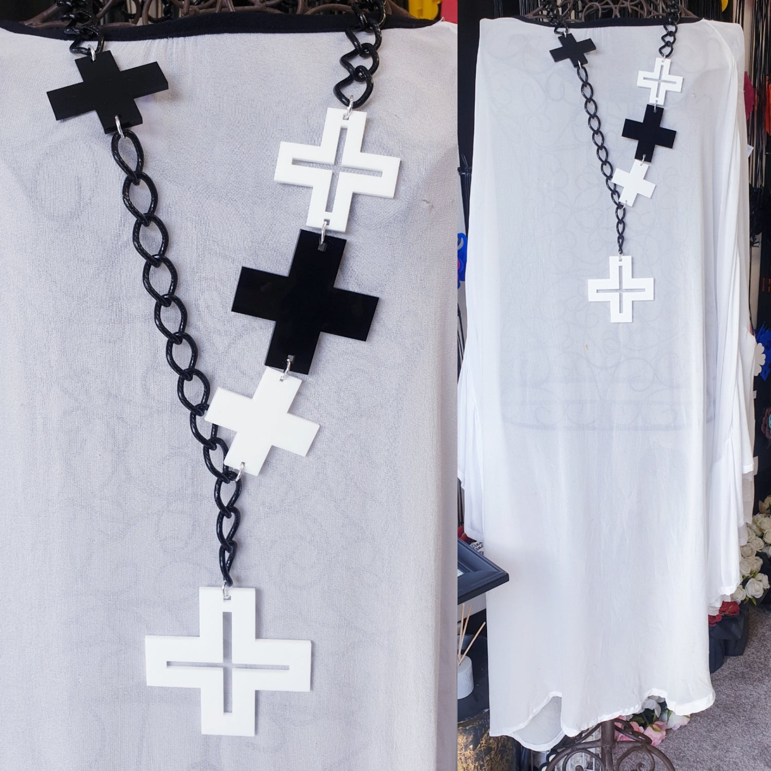 A modern take on a lariat necklace, Statement Style! Long necklace with bright bold adornments, arranged in a abstract style. Extremely flattering on the body, as it draws the eye down the length of the body.