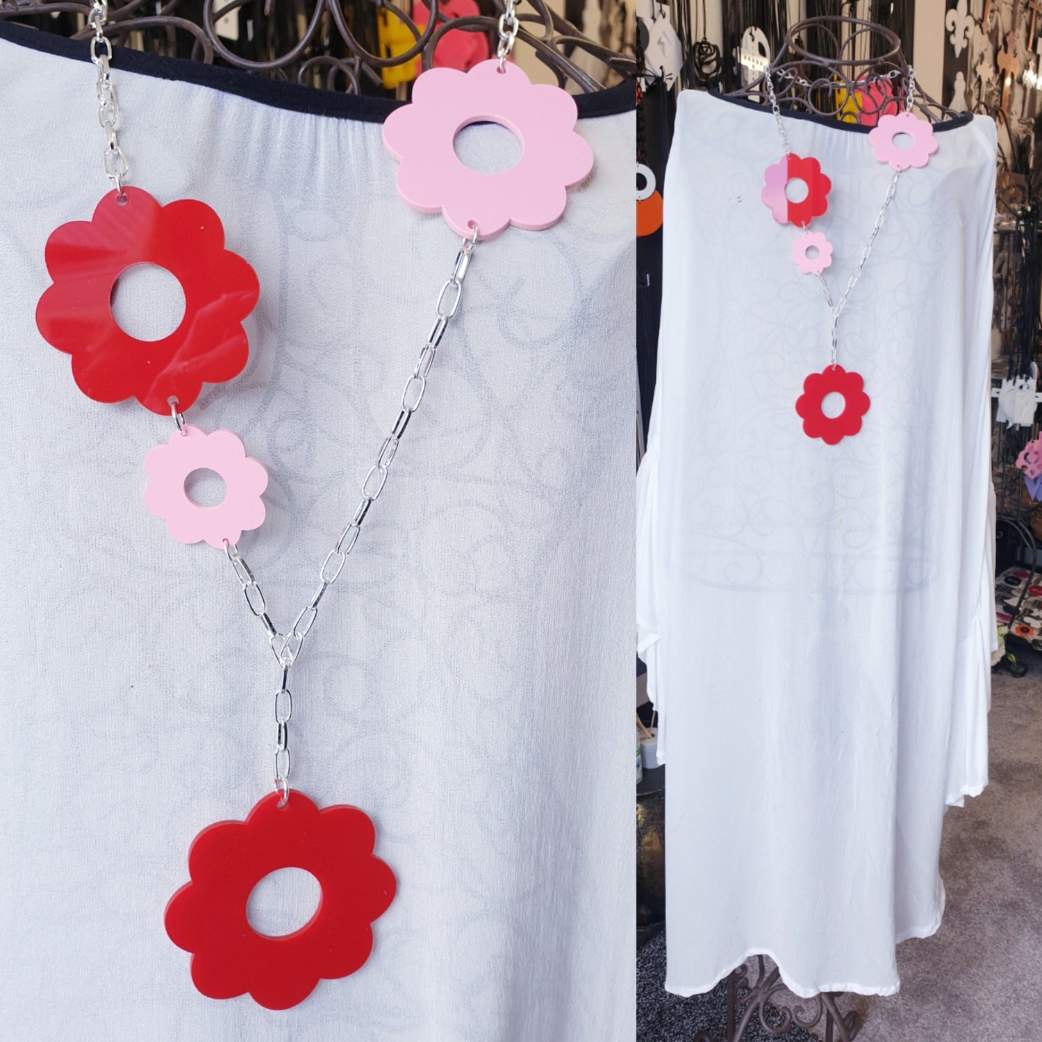 A modern take on a lariat necklace, Statement Style! Long necklace with bright bold adornments, arranged in a abstract style. Extremely flattering on the body, as it draws the eye down the length of the body.
