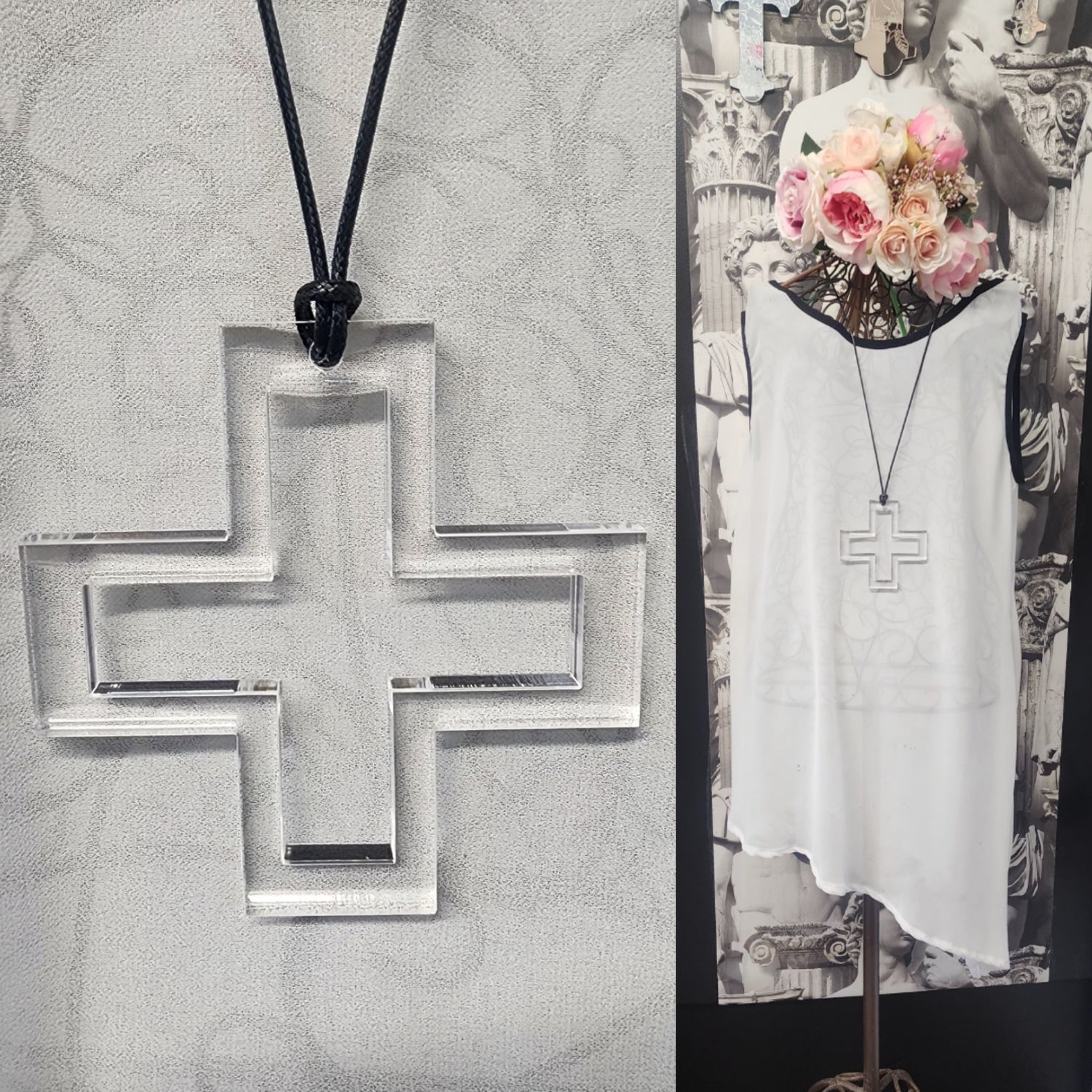 Laser cut from 6mm sturdy Acrylic and hung on soft pliable waxed cord with an adjustment bead.