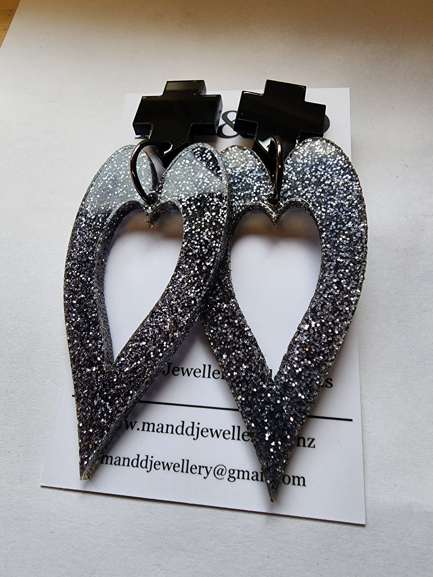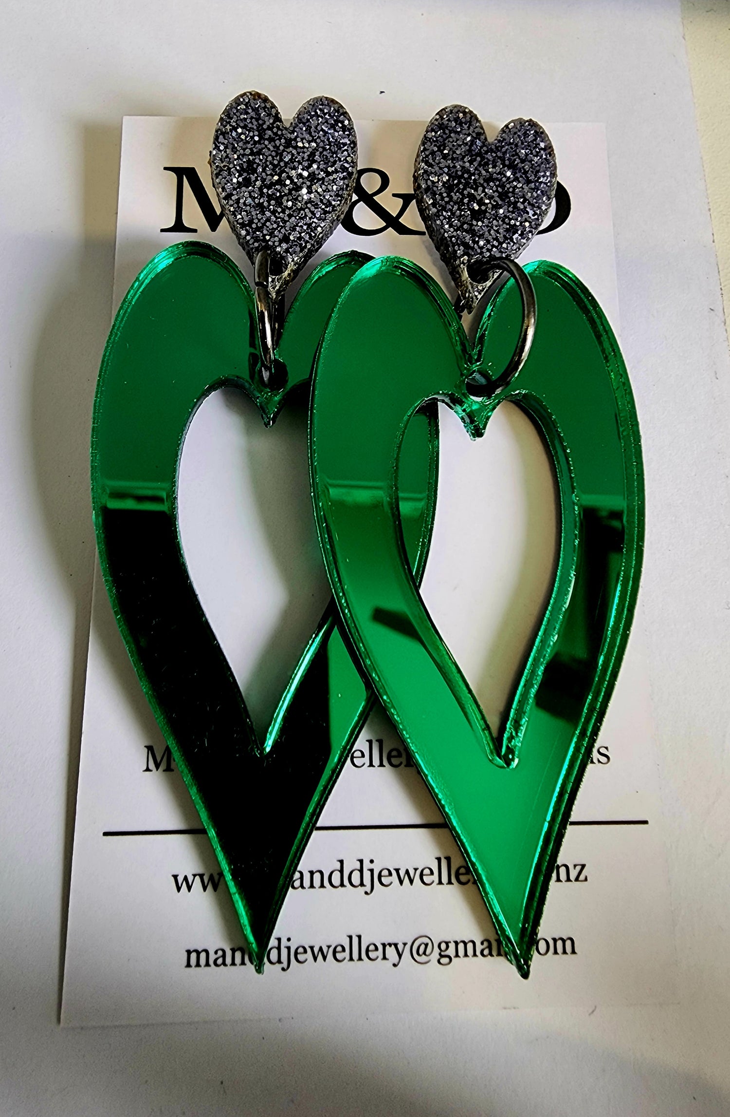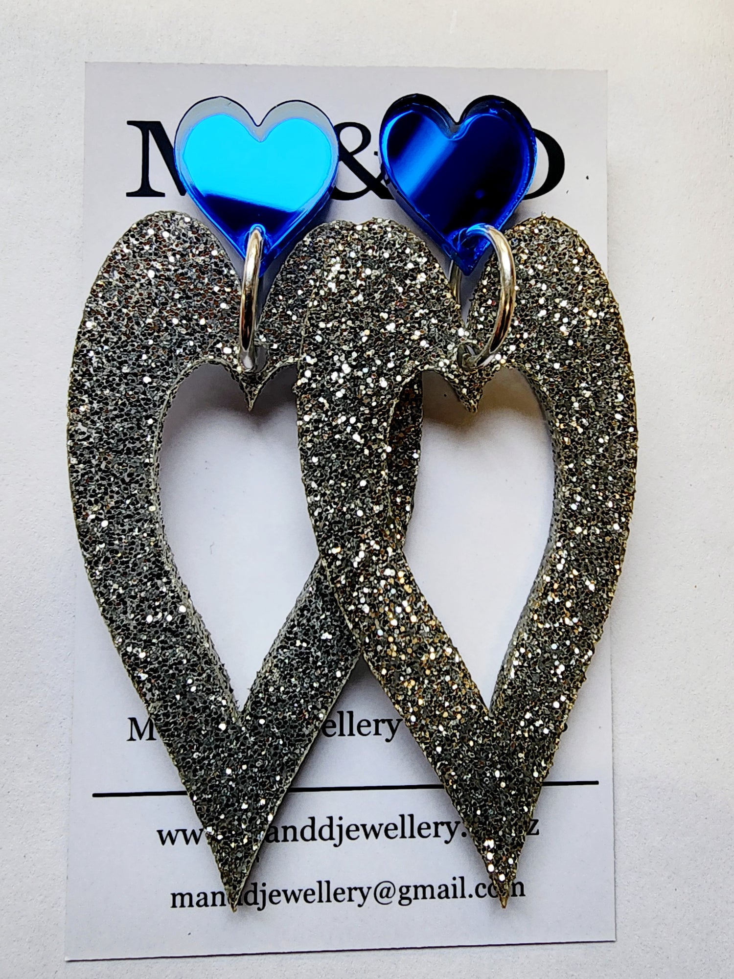 Beautiful Long Heart Earrings created with our stunning mirror and glitter acrylics.